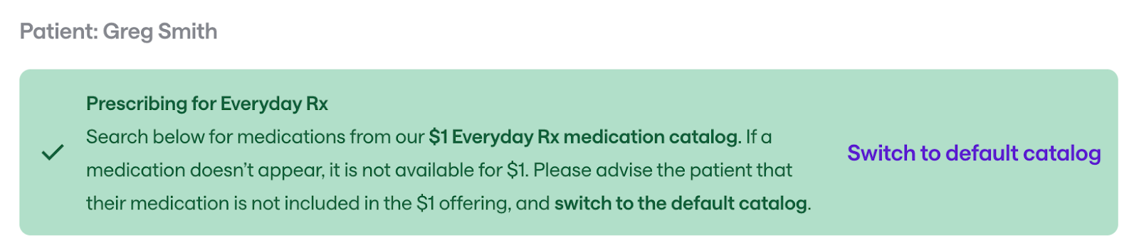 - In that case, notify the patient that their medication isn’t included in the $1 catalog and switch to the default catalog using the link at the top of the page.
