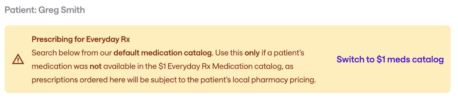 - A yellow banner will let you know you’re ordering from the default medication catalog. Medications ordered here will be subject to pricing at the patient’s preferred pharmacy: