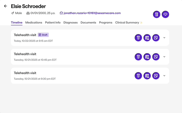 Sesame’s integrated Electronic Health Record (EHR) system serves as the central hub for all patient information and documentation. Each patient has a Sesame chart that includes intake forms, program-specific questionnaires, visit history, clinical notes from other Sesame providers, medication history, and diagnoses—all within one secure platform.