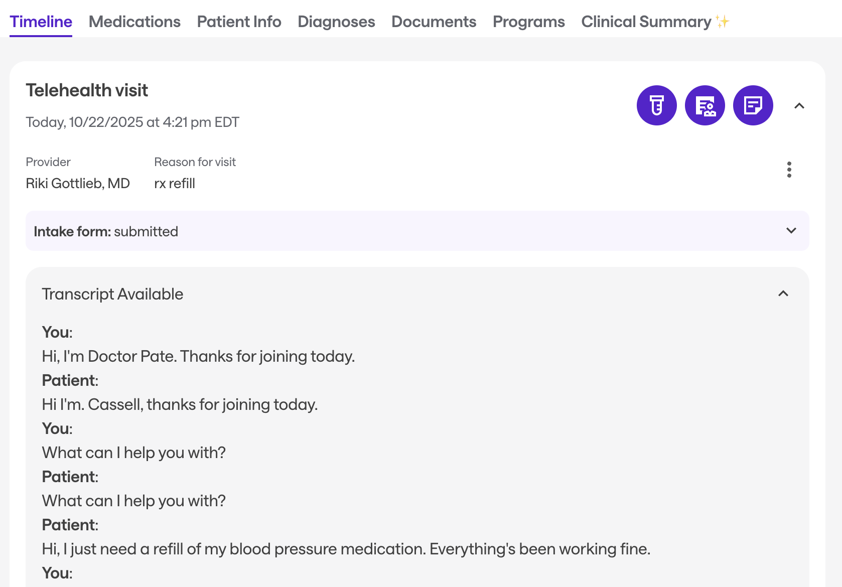 When enabled, AI transcripts automatically generate after video visits where the patient has provided digital consent. These appear within the corresponding visit entry, giving you a text-based record of the conversation.