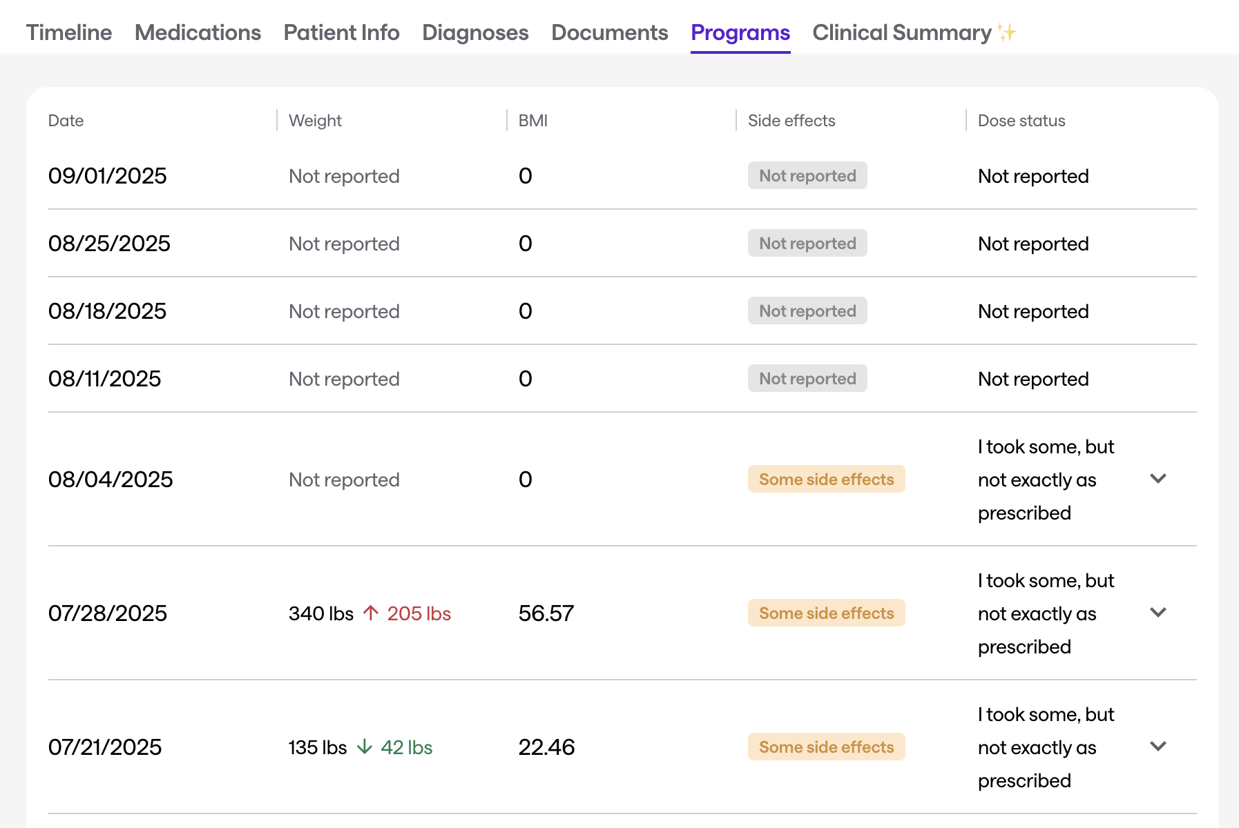 The Programs tab displays data from weekly app check-ins for Success by Sesame patients, allowing you to review progress, side effects, and medication adherence between visits.